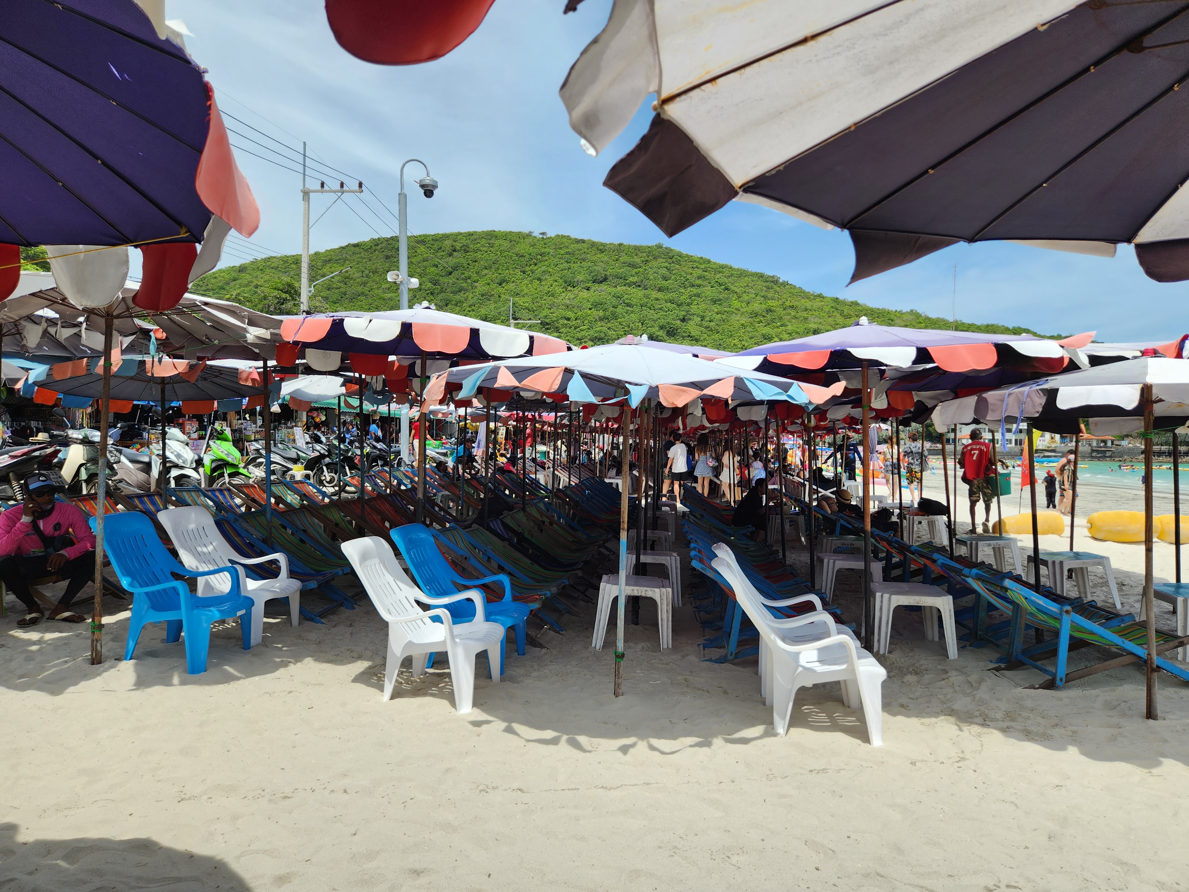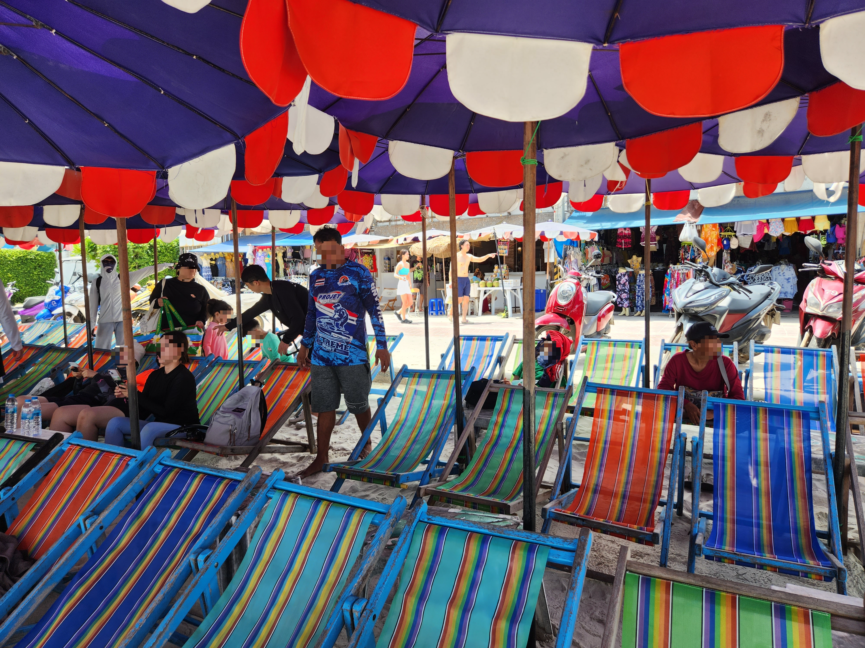 해변에는 굉장히 많은 썬베드가 있어서